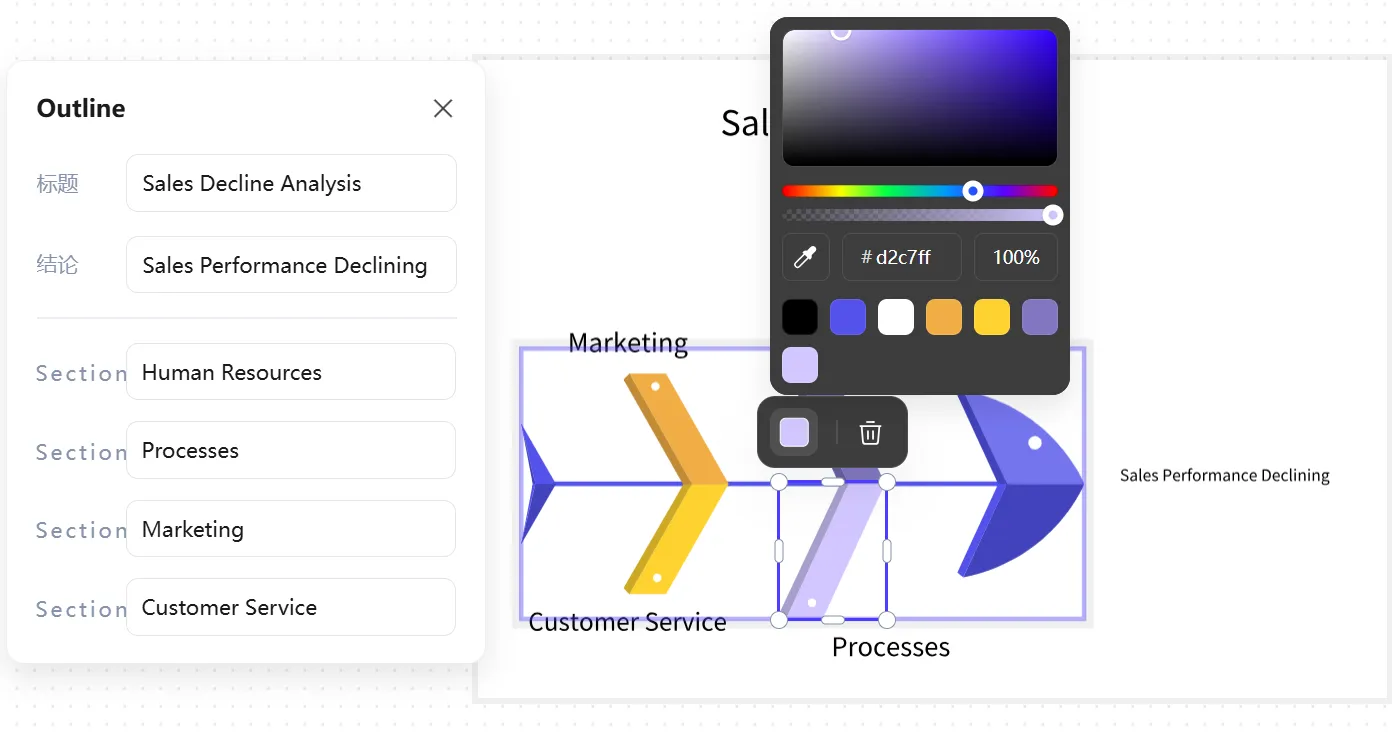 PicDoc提供多種魚骨圖模板。生成的圖表可從多種類型和風(fēng)格的模板中選擇,外觀也可自由定制。