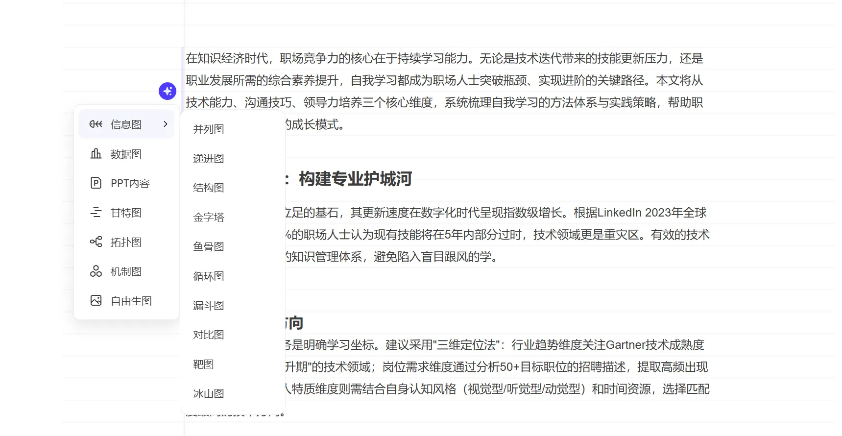 3. 在左側(cè)生成按鈕選擇適配的圖表類型(如信息圖表/數(shù)據(jù)圖表/甘特圖等),AI自動生成圖表。