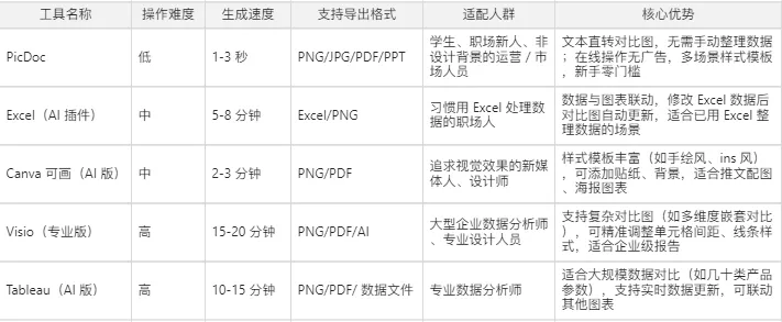 如果你也常為“數(shù)據(jù)整理繁瑣、圖表設(shè)計(jì)費(fèi)時(shí)”而困擾,PicDoc智能工具或許正是你需要的解決方案——無需安裝,打開網(wǎng)頁、粘貼文本,即可一鍵生成可編輯的對比圖,并直接導(dǎo)出適用于PPT、Word或PDF的格式。何不現(xiàn)在就嘗試上傳你的第一組對比數(shù)據(jù)?讓AI幫你完成可視化的技術(shù)環(huán)節(jié),而你只需專注思考數(shù)據(jù)背后的故事,把時(shí)間留給真正重要的分析與決策。