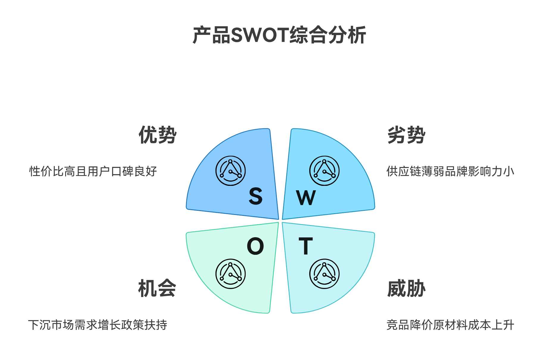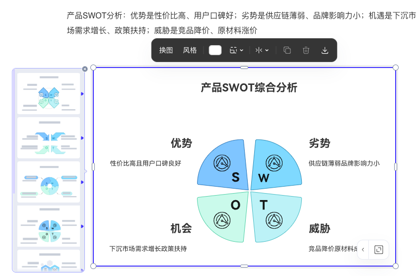 Step1:整理文本內容。將SWOT相關信息按自然語言梳理,無需特定格式,比如“產品SWOT分析:優(yōu)勢是性價比高、用戶口碑好;劣勢是供應鏈薄弱、品牌影響力小;機遇是下沉市場需求增長、政策扶持;威脅是競品降價、原材料漲價”;