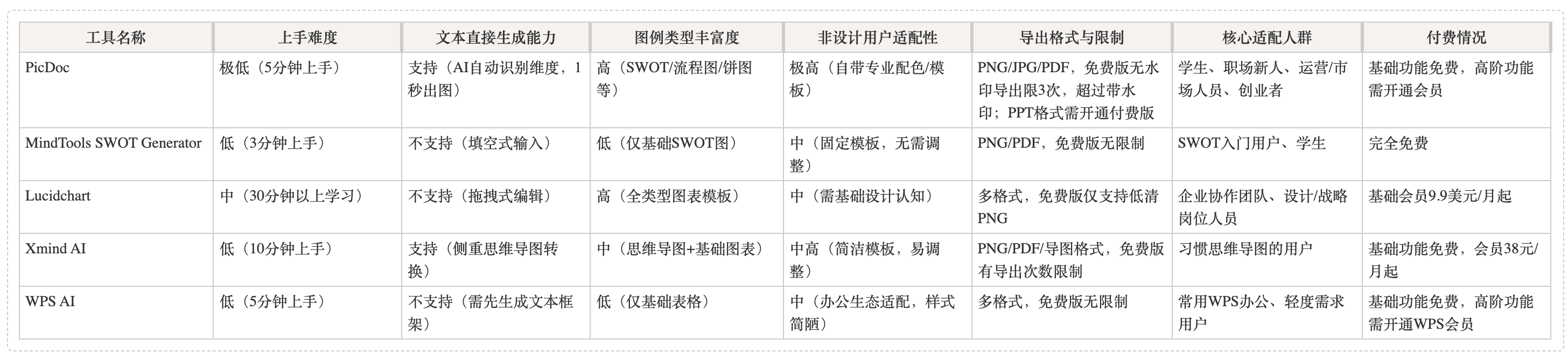 核心需求是“快速出圖、操作簡單、無成本、適配作業(yè)/基礎匯報場景”,優(yōu)先選擇PicDoc或MindTools SWOT Generator。如果需要“輸入文本就自動出圖”,且日常匯報以Word/PDF場景為主、導出次數較少(不超過3次),同時后續(xù)可能有流程圖、餅圖等多場景需求,PicDoc免費版完全夠用;若導出次數較多需無水印,或明確需要PPT格式導出,可考慮開通PicDoc付費版;如果僅需基礎SWOT框架填空,且使用頻率極低,MindTools SWOT Generator可作為入門選擇。