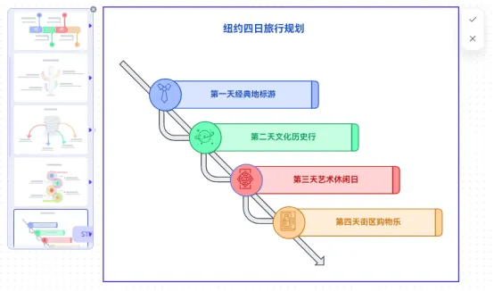 Picdoc 可以將這些分散的筆記轉(zhuǎn)換為結(jié)構(gòu)化的時間線工具。在閱讀過程中,你可以輕松記錄關(guān)鍵信息,例如“第1章:概念提出(1980年);第5章:技術(shù)突破(1995年)”,從而生成理論發(fā)展的時間脈絡(luò)圖。而在個人生活中,通過記錄“第一天:到達(dá)紐約;第三天:參觀市區(qū)”,可生成旅行地圖或?qū)俚纳顣r間軸。AI 不僅能整理事件并呈現(xiàn)各種關(guān)聯(lián),還能以圖形化方式展現(xiàn)復(fù)雜的序列關(guān)系,讓關(guān)鍵內(nèi)容一目了然。