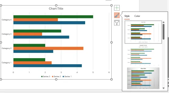 右側(cè)邊框有三個圖標。點擊第二個像一支畫筆的圖標,就可以更改圖表的樣式和顏色,使其與整個 PowerPoint 的風(fēng)格相匹配。