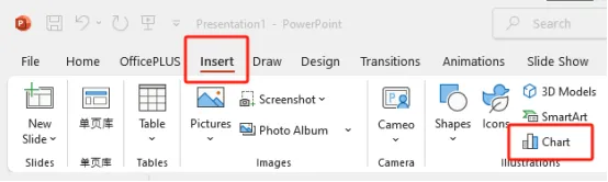 在工具欄上選擇“插入”按鈕,您將在插圖區(qū)域看到“圖表”選項。