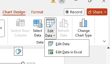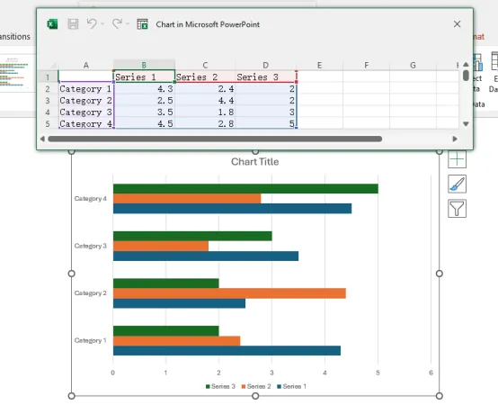 點擊“編輯數(shù)據(jù)”按鈕,即可在Excel中編輯和處理數(shù)據(jù)。眾所周知,借助Excel的各種功能,在Excel中編輯數(shù)據(jù)比在PowerPoint中更輕松。