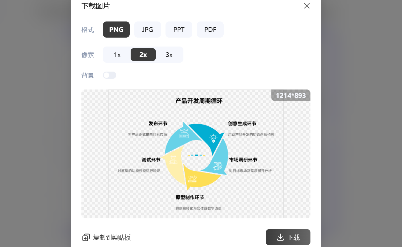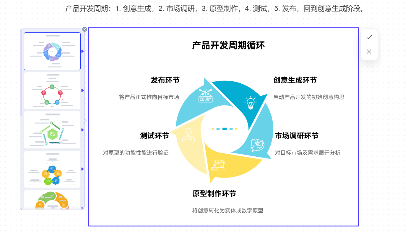 準備好內(nèi)容后,點擊「生成」按鈕。AI 會分析內(nèi)容,并自動選擇最合適的圖表或信息圖類型。例如上面產(chǎn)品開發(fā)周期的例子,就會生成周期循環(huán)圖。
