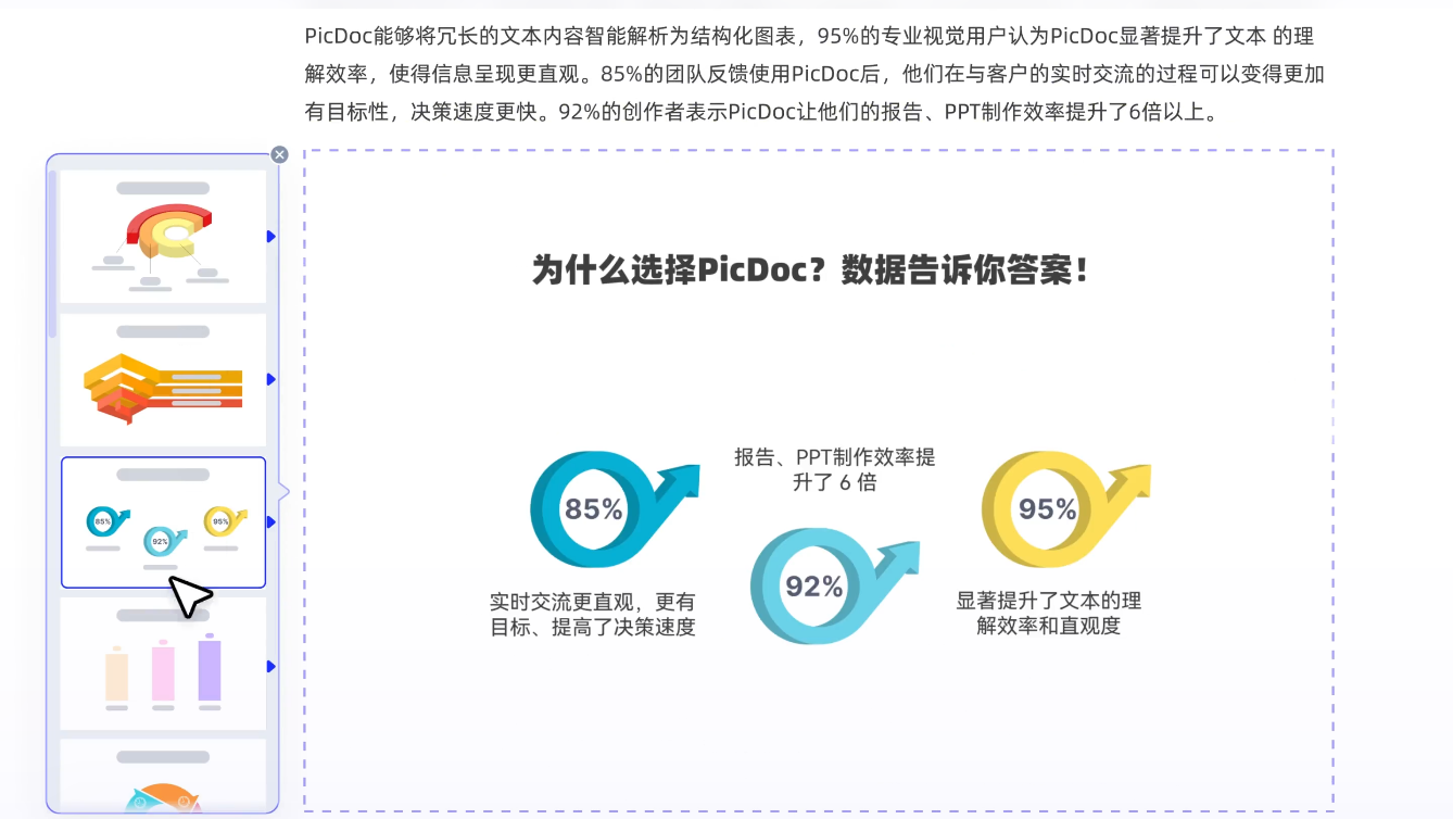 這些圖表在各種業(yè)務(wù)場景中都很有用,尤其適用于戰(zhàn)略制定、數(shù)據(jù)分析和演示。此外,PicDoc還在不斷更新,將來會支持更多信息圖類型。