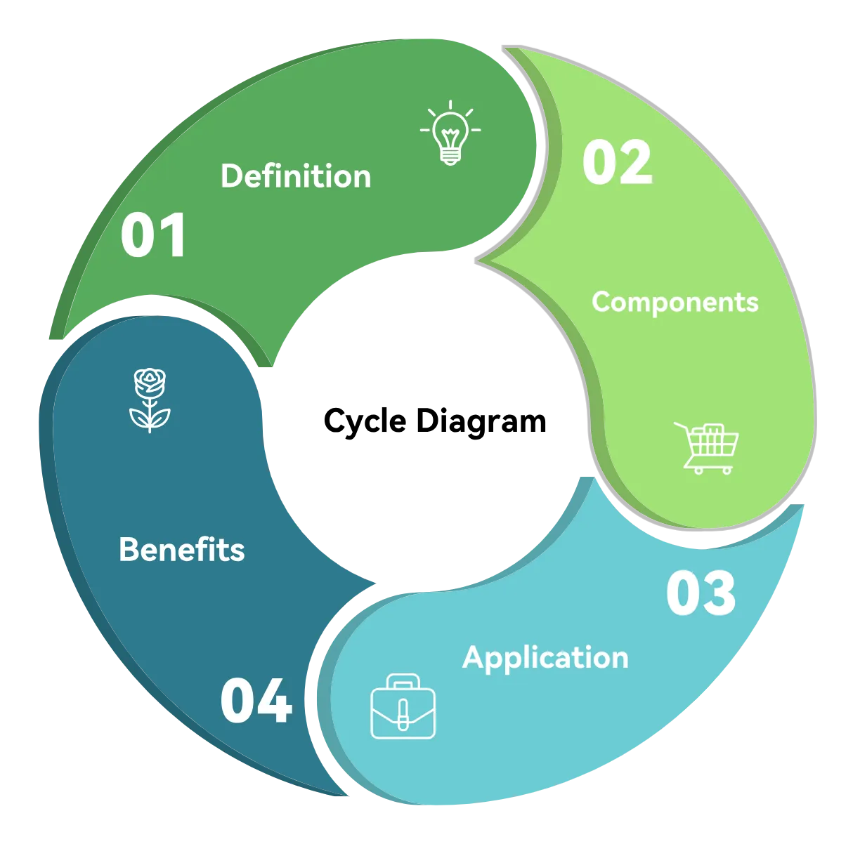 • 結(jié)構(gòu):一個(gè)簡(jiǎn)單的圓形被劃分為等分段,每個(gè)段代表一個(gè)階段;箭頭連接相鄰段,形成閉合環(huán)路。