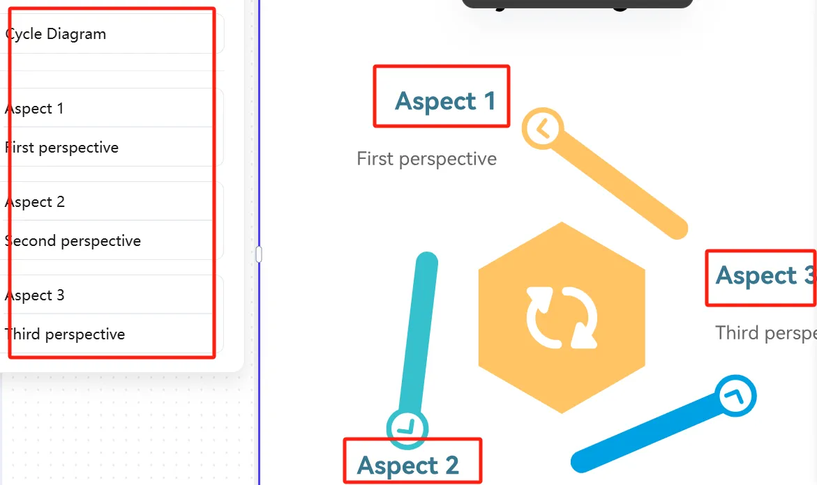 在循環(huán)圖中,AI已經(jīng)預(yù)先填寫了具體文本信息。如果想要更改,您可直接在左側(cè)大綱中編輯,或點(diǎn)擊每個(gè)文本框逐一填寫。