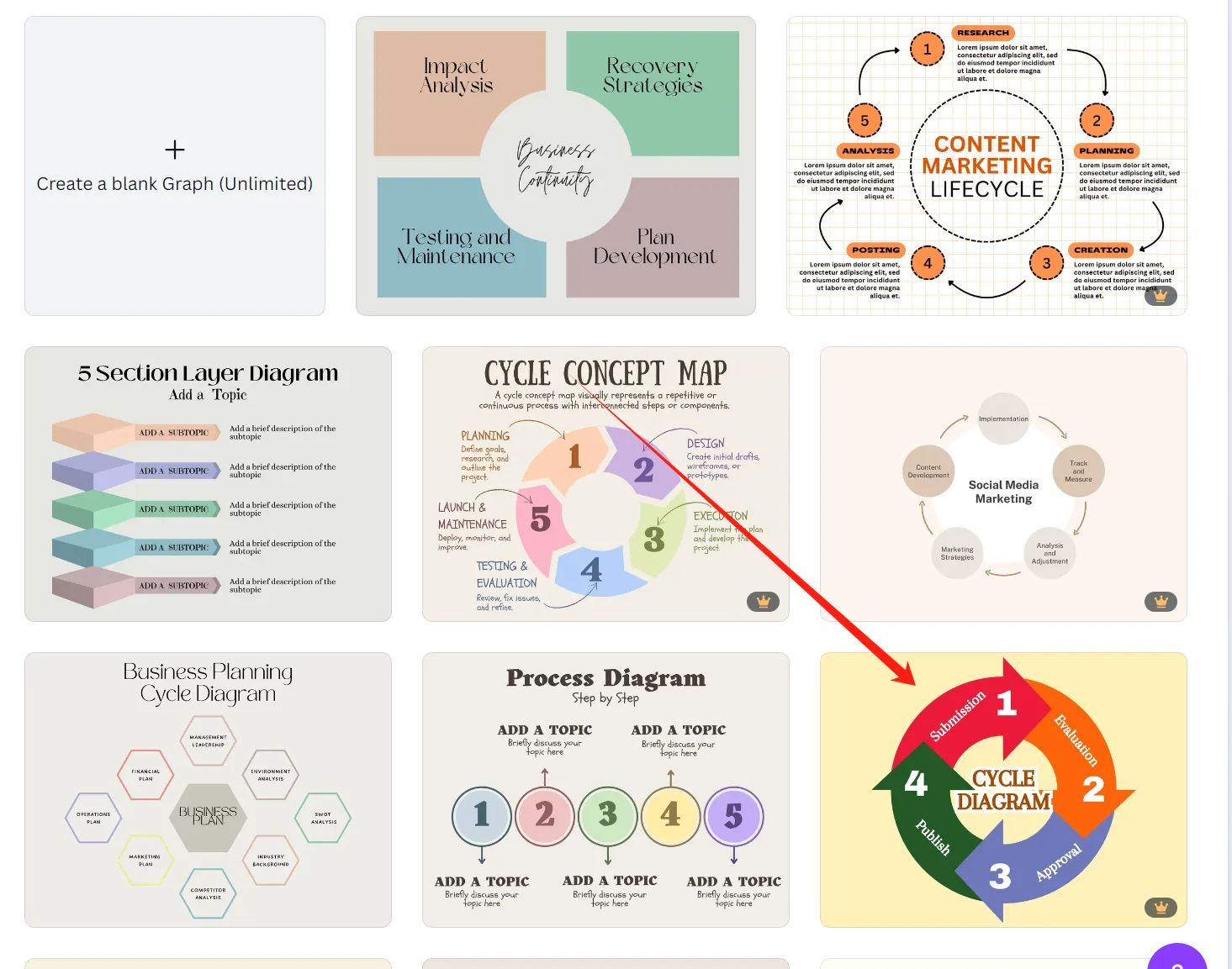 瀏覽AI生成的循環(huán)圖模板。選擇與您的循環(huán)類型相匹配的模板——例如,使用圓形模板表示簡(jiǎn)單循環(huán),或使用螺旋模板表示以增長(zhǎng)為重點(diǎn)的循環(huán)。