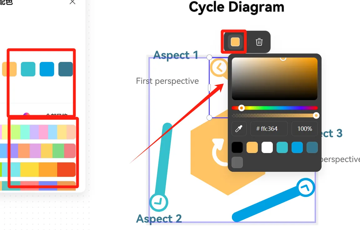接下來,我們將進(jìn)行一些調(diào)整。左側(cè)功能欄提供不同的顏色結(jié)構(gòu)組合,您還可以點(diǎn)擊特定形狀來更改其顏色。此外,點(diǎn)擊形狀并移動(dòng)鼠標(biāo),可自由移動(dòng)形狀并調(diào)整其位置。