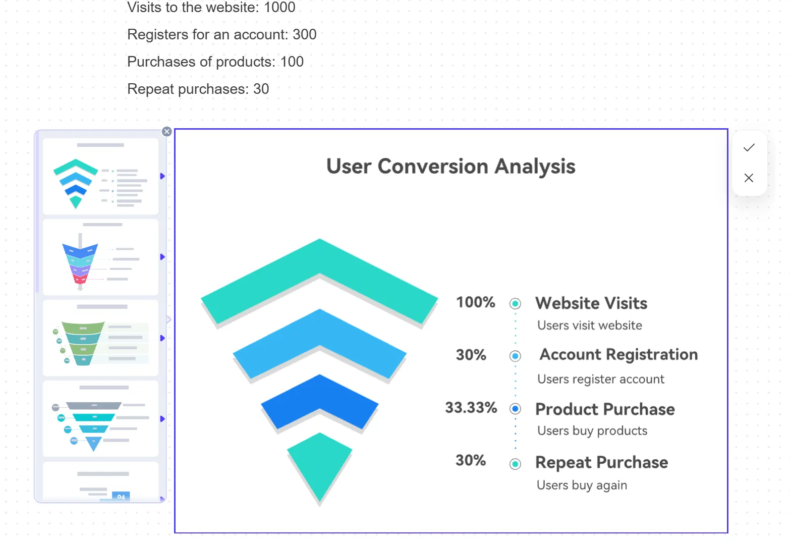 Boardmix 是一款功能強(qiáng)大的在線協(xié)作白板工具,同時(shí)憑借 AI 技術(shù)在生成漏斗圖方面表現(xiàn)出色,深受團(tuán)隊(duì)用戶喜愛。其獨(dú)特的 AI 助手讓創(chuàng)建漏斗圖變得快速且簡單。用戶只需在輸入框中用清晰簡潔的語言描述漏斗圖的內(nèi)容,例如“展示教育培訓(xùn)機(jī)構(gòu)從潛在學(xué)生咨詢到報(bào)名付款的轉(zhuǎn)化漏斗”,Boardmix 的 AI 即可快速理解用戶意圖,并基于先進(jìn)的算法和豐富的行業(yè)知識庫生成相應(yīng)的漏斗圖框架。該框架不僅準(zhǔn)確反映用戶描述的業(yè)務(wù)流程,還為每個(gè)環(huán)節(jié)提供了合理的分層劃分與布局,為用戶后續(xù)的精細(xì)化編輯工作奠定了良好基礎(chǔ)。
