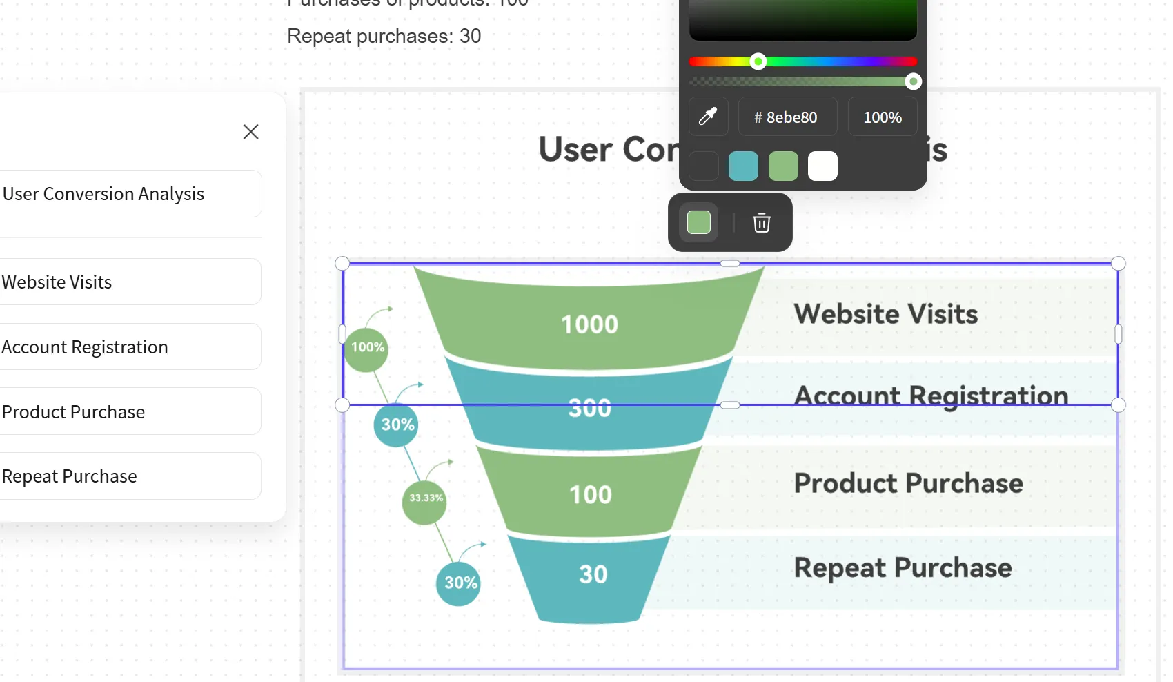 在圖表編輯環(huán)節(jié),PicDoc的操作體驗(yàn)堪稱卓越,簡單直觀如拼湊拼圖般輕松。在生成的漏斗圖中,所有文字和圖形均可單獨(dú)拖放,完全貼合用戶的個(gè)性化編輯需求。用戶只需單擊鼠標(biāo)即可輕松更改漏斗圖的顏色和字體,為圖表賦予獨(dú)特的視覺風(fēng)格。即使沒有設(shè)計(jì)背景,您仍可借助這些強(qiáng)大功能,輕松制作出兼具專業(yè)性和美觀性的可視化作品。