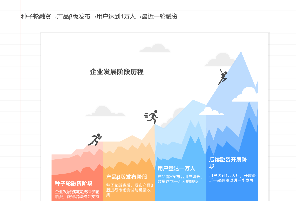 某家科技初創(chuàng)公司用時(shí)間軸展示了從成立以來的成長歷程,并用于面向投資者的演示文稿中。通過使用PicDoc,將“種子輪融資→產(chǎn)品β版發(fā)布→用戶達(dá)到1萬人→最近一輪融資”這一流程進(jìn)行可視化后,投資者的理解度顯著提升,融資談判順利進(jìn)行。