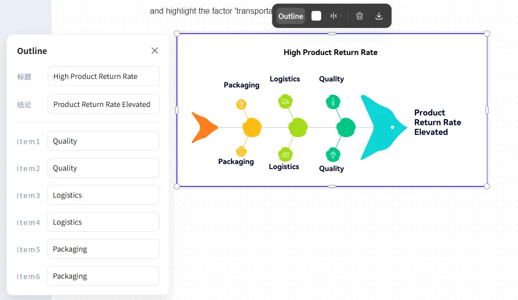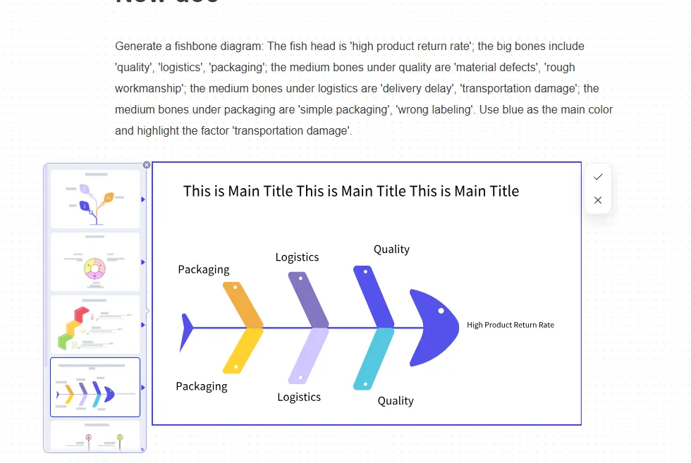 3.點擊輸入框左側(cè)的藍(lán)色按鈕,AI將自動識別因果關(guān)系并生成完整的魚骨圖。您還可以選擇左側(cè)顯示的不同樣式。