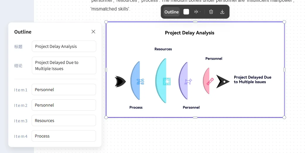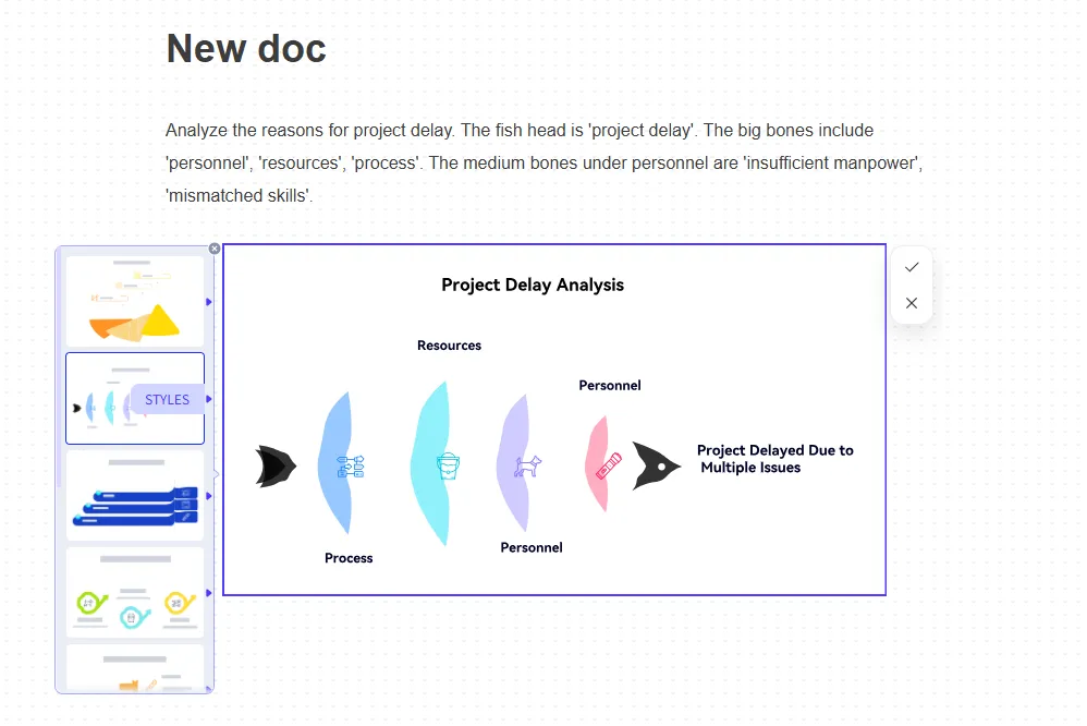 • 無需四處找模板:首先輸入內(nèi)容(例如“分析項目延遲的原因。魚頭是‘項目延遲’。大骨包括‘人員’、‘資源’和‘流程’。人員下的中骨包括‘人力不足’、‘技能不匹配’...”)。AI會自動幫你適配魚骨圖。
