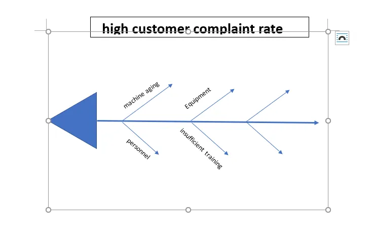 2.同樣,在每個大骨、中骨和小骨旁邊添加文本框,并分別填寫類別(如“人員”、“設(shè)備”)和具體原因(如“培訓(xùn)不足”、“設(shè)備老化”)。