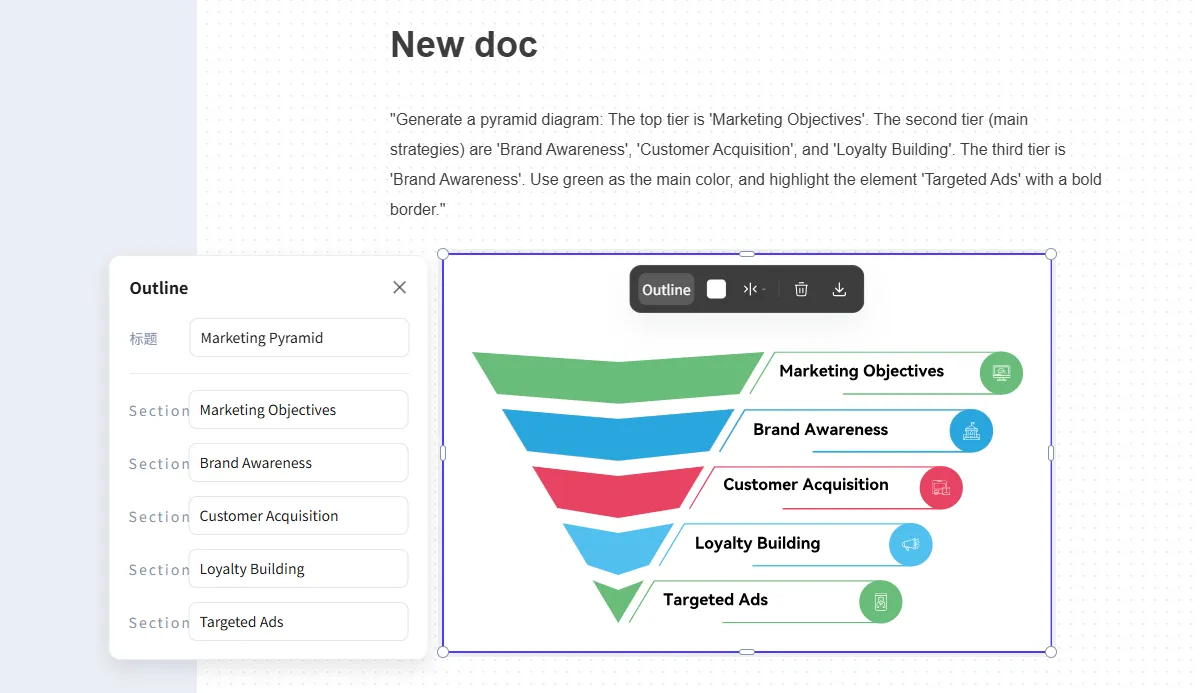 在此,我強(qiáng)烈推薦PicDoc。它徹底改變了金字塔圖表的制作方式。只需輸入文本描述,即可在數(shù)秒內(nèi)生成結(jié)構(gòu)清晰、風(fēng)格專業(yè)的圖表,明確展現(xiàn)層級關(guān)系。它自動處理層級比例、元素對齊及格式設(shè)置,無需手動設(shè)計。生成后,可輕松修改標(biāo)簽、顏色或?qū)蛹壗Y(jié)構(gòu),并最終導(dǎo)出高分辨率文件以適應(yīng)不同場景。