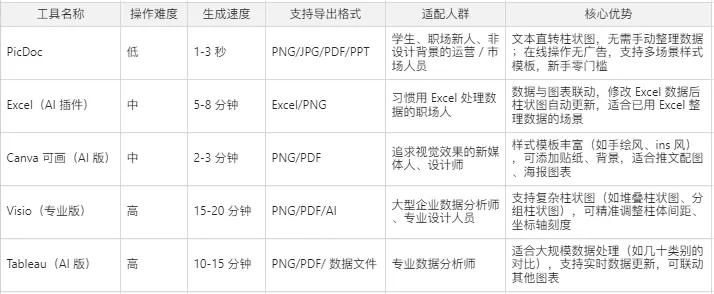 1. 核心邏輯:用 AI 生成柱狀圖的關鍵是 “選對工具 + 理好數(shù)據(jù)”,優(yōu)先選 PicDoc 這類零門檻工具,避免陷入 “學復雜軟件” 的誤區(qū);