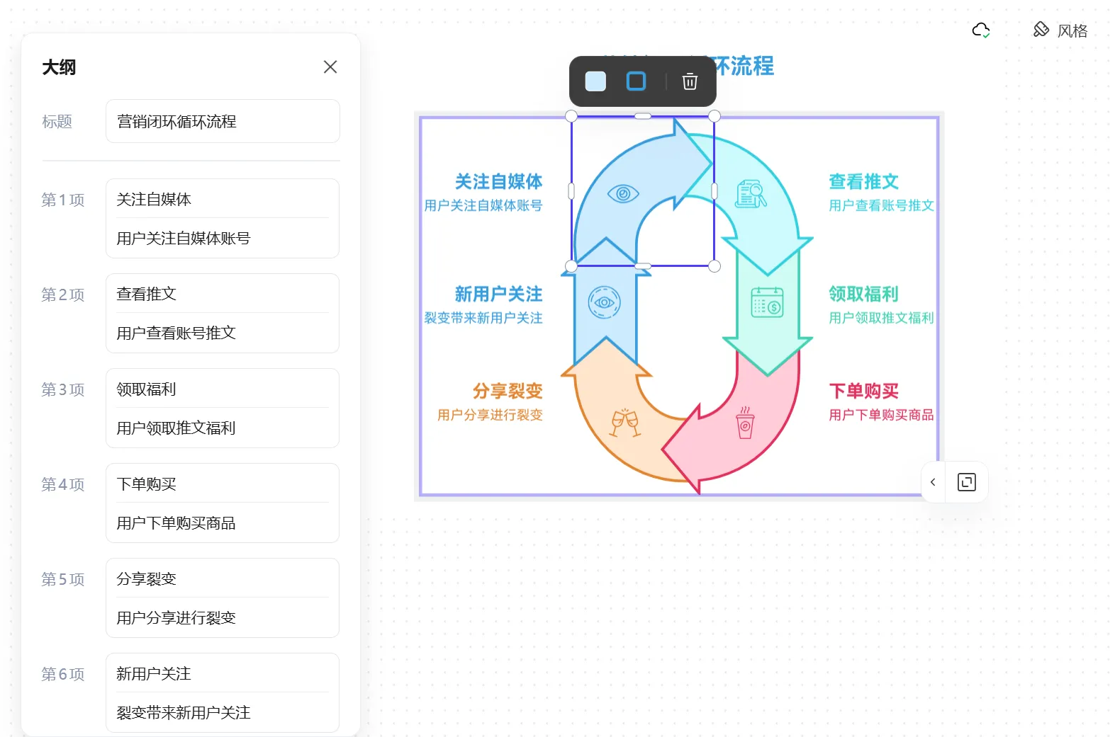 點(diǎn)擊“生成”按鈕,AI會(huì)在幾秒內(nèi)自動(dòng)生成循環(huán)圖;若對(duì)節(jié)點(diǎn)樣式、配色不滿意,可點(diǎn)擊調(diào)整;或通過編輯選項(xiàng)來應(yīng)用預(yù)設(shè)模板樣式;當(dāng)然,也可以通過“大綱”或雙擊來更改文本。