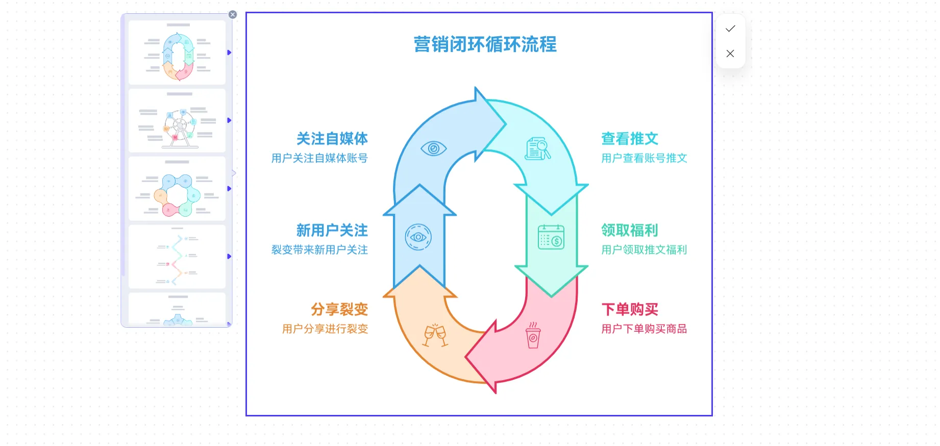 在文檔頁(yè)面中,清晰描述循環(huán)鏈路的核心節(jié)點(diǎn)與關(guān)系,比如“營(yíng)銷閉環(huán):用戶關(guān)注自媒體賬號(hào)-查看推文-領(lǐng)取福利-下單購(gòu)買-分享裂變-新用戶關(guān)注”;可以在文本前或文本后加一句“生成循環(huán)圖”(PicDoc會(huì)識(shí)別并優(yōu)先推薦指定的圖表)。