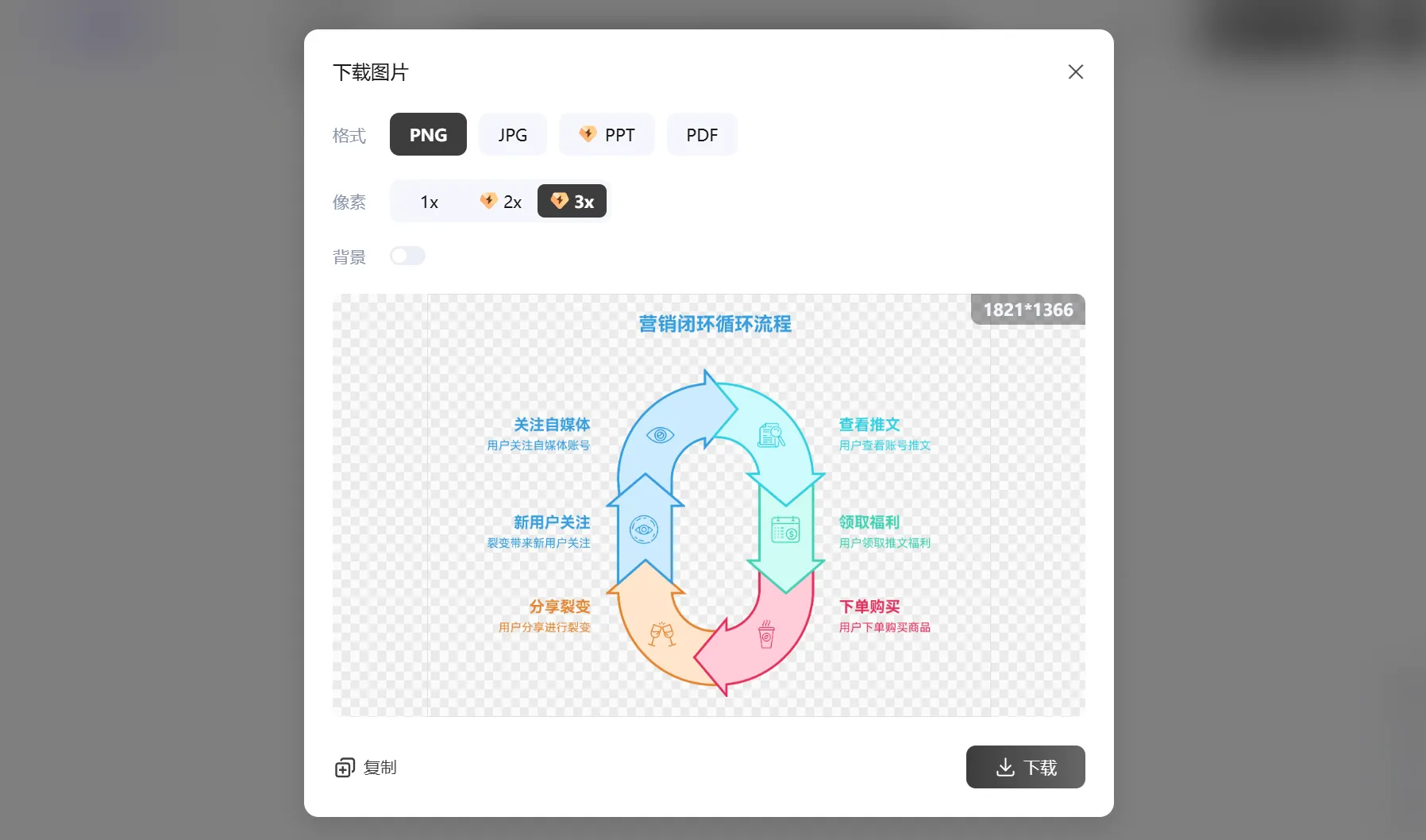 確認(rèn)循環(huán)圖無誤后,點(diǎn)擊“下載”,選擇PNG、PDF或PPT等格式,直接用于演示文稿、報(bào)告或推文。