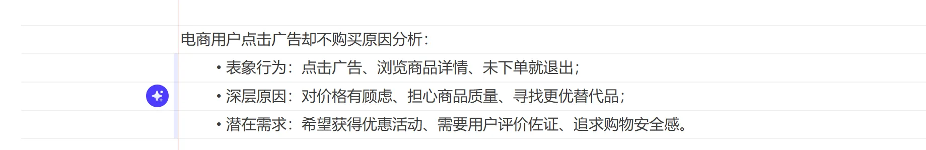 先確定冰山圖的使用場(chǎng)景和最終目的(如用戶(hù)需求分析、問(wèn)題拆解),再按“表象-深層-潛在”的邏輯梳理文本信息。比如做“電商用戶(hù)點(diǎn)擊廣告卻不購(gòu)買(mǎi)”的需求分析,可梳理為: