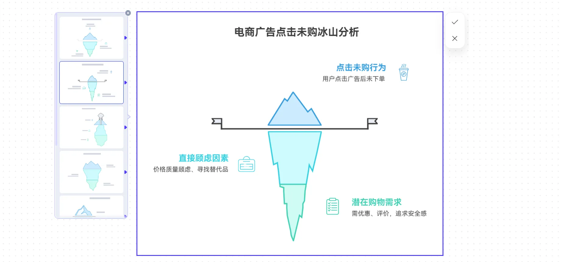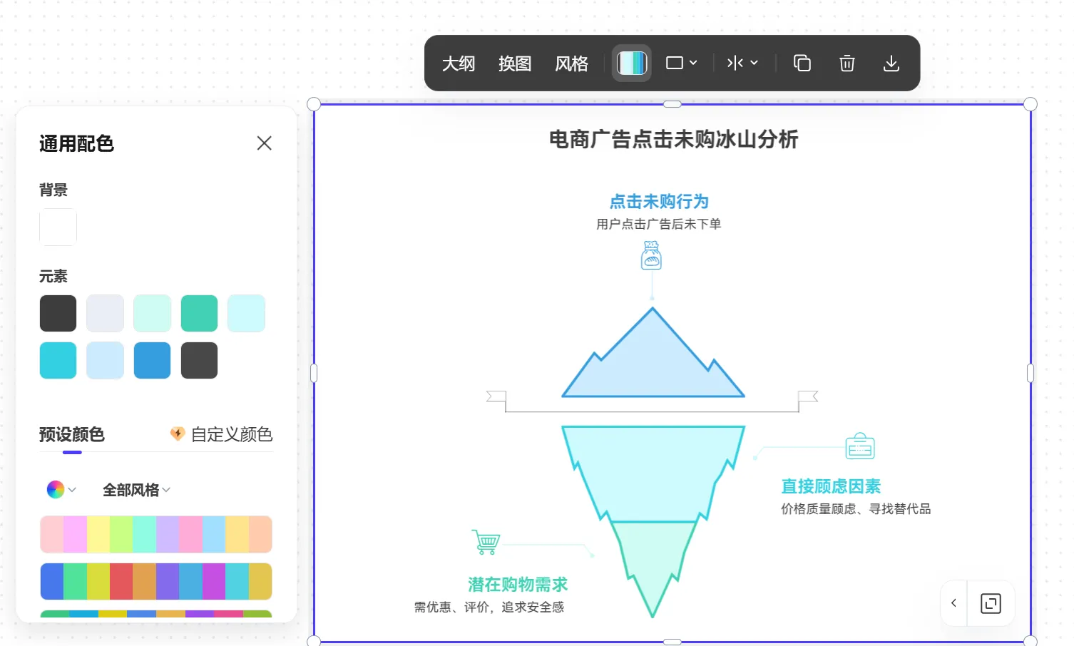 2. 工具使用技巧:用PicDoc時(shí),可使用“換圖”功能預(yù)覽多款冰山圖模板,文本內(nèi)容自動(dòng)保留,效率更高;編輯時(shí)可通過(guò)“大綱”調(diào)整層級(jí)數(shù)量和順序,讓冰山圖的視覺(jué)比例更合理;