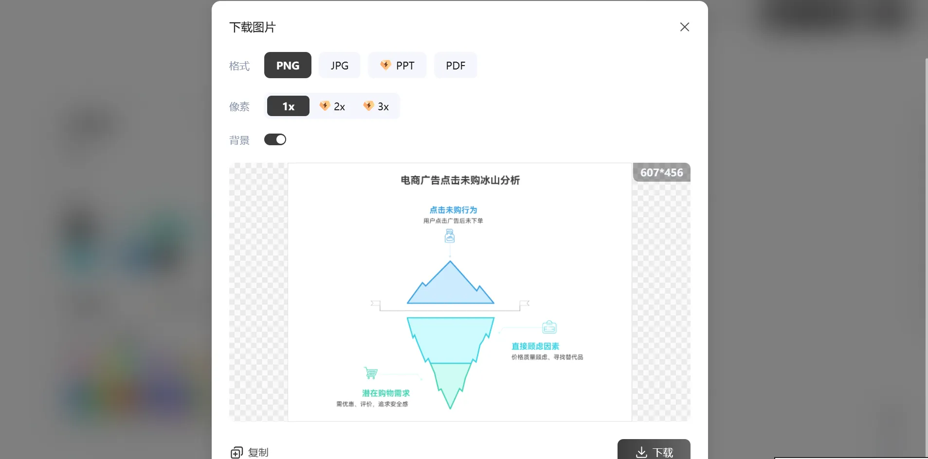 優(yōu)化完成后,點(diǎn)擊編輯欄中的“下載”按鈕,選擇PNG、PDF等常用格式,保存到本地或者直接復(fù)制,即可用于匯報(bào)、論文或運(yùn)營(yíng)發(fā)布素材。