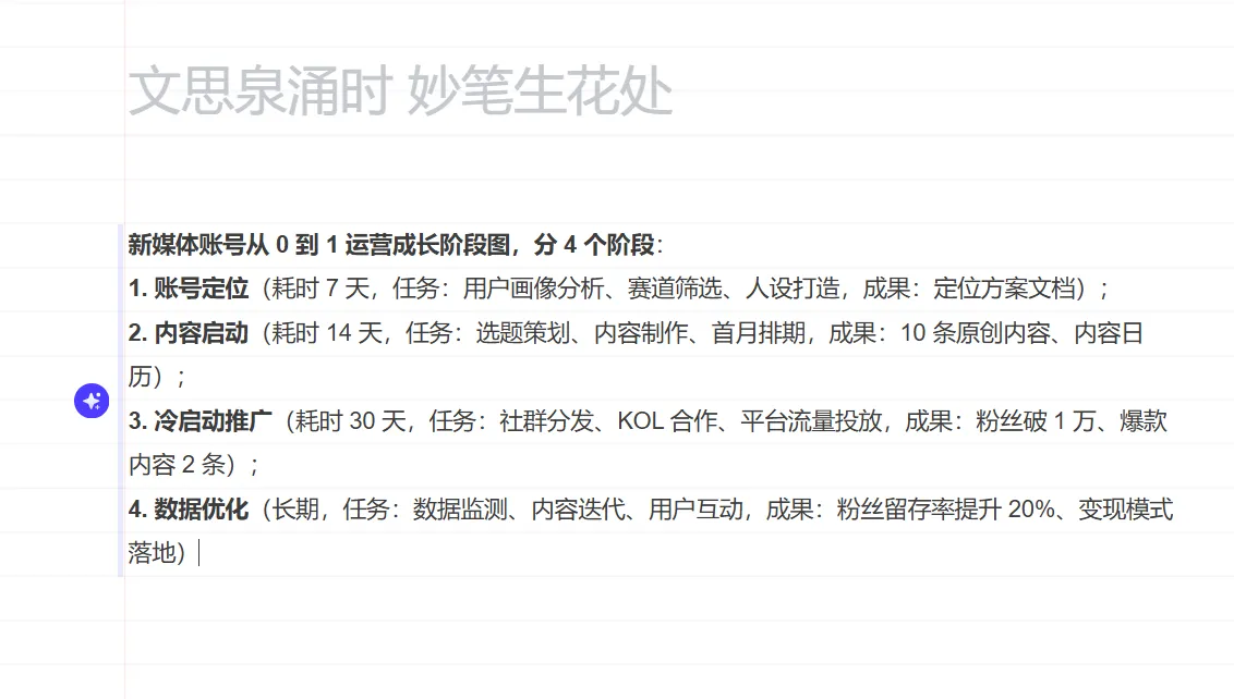 我當(dāng)時輸入的指令是:“新媒體賬號從 0 到 1 運營成長階段圖,分 4 個階段:1. 賬號定位(耗時 7 天,任務(wù):用戶畫像分析、賽道篩選、人設(shè)打造,成果:定位方案文檔);2. 內(nèi)容啟動(耗時 14 天,任務(wù):選題策劃、內(nèi)容制作、首月排期,成果:10 條原創(chuàng)內(nèi)容、內(nèi)容日歷);3. 冷啟動推廣(耗時 30 天,任務(wù):社群分發(fā)、KOL 合作、平臺流量投放,成果:粉絲破 1 萬、爆款內(nèi)容 2 條);4. 數(shù)據(jù)優(yōu)化(長期,任務(wù):數(shù)據(jù)監(jiān)測、內(nèi)容迭代、用戶互動,成果:粉絲留存率提升 20%、變現(xiàn)模式落地)”