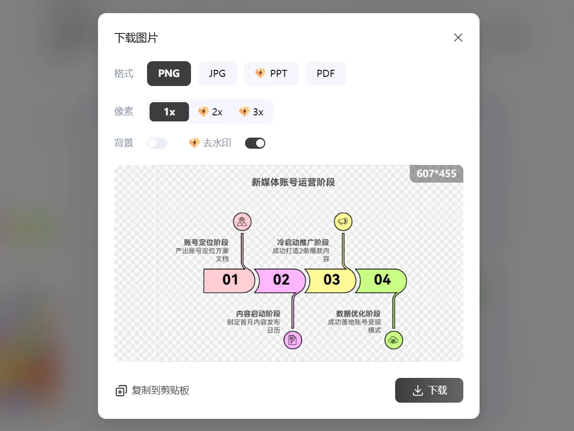 其實 PicDoc 這類圖表的操作,和它其他功能一樣 “零門檻”,但有幾個小技巧能讓效果更出彩。我以 “新媒體賬號從 0 到 1 運營成長階段圖” 為例,帶大家走一遍完整流程: