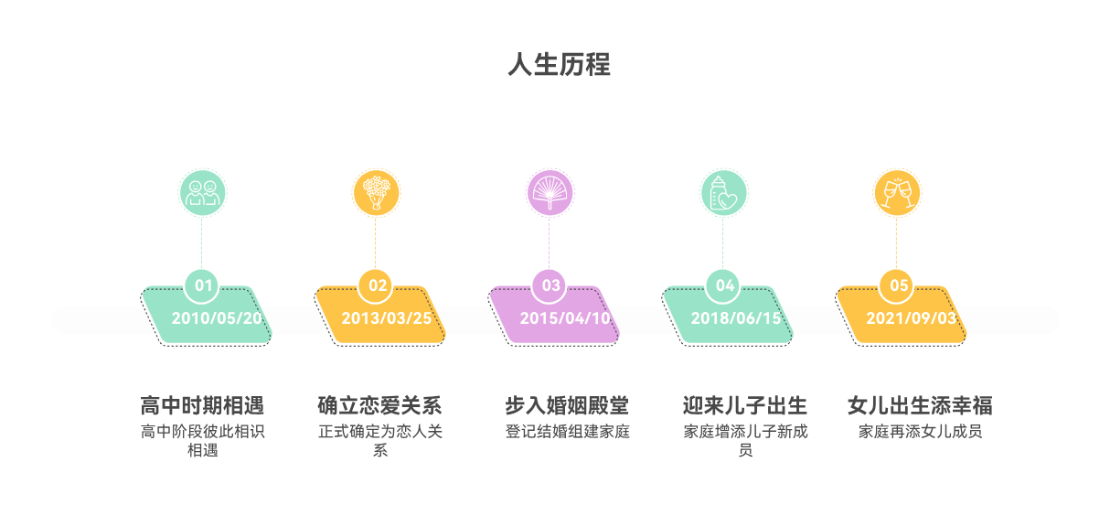 • 生成結(jié)果:按照時間順序排列的漂亮?xí)r間線。每個事件都會自動添加合適的圖標,結(jié)婚和生育等重要事件會突出顯示。