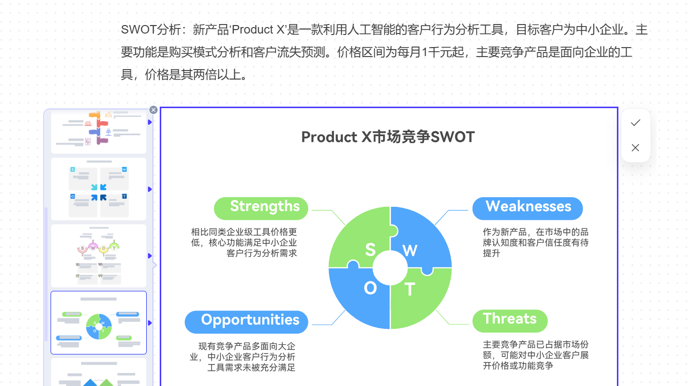 “SWOT分析:新產品‘Product X’是一款利用人工智能的客戶行為分析工具,目標客戶為中小企業(yè)。主要功能是購買模式分析和客戶流失預測。價格區(qū)間為每月1千元起,主要競爭產品是面向企業(yè)的工具,價格是其兩倍以上?!?/span>
