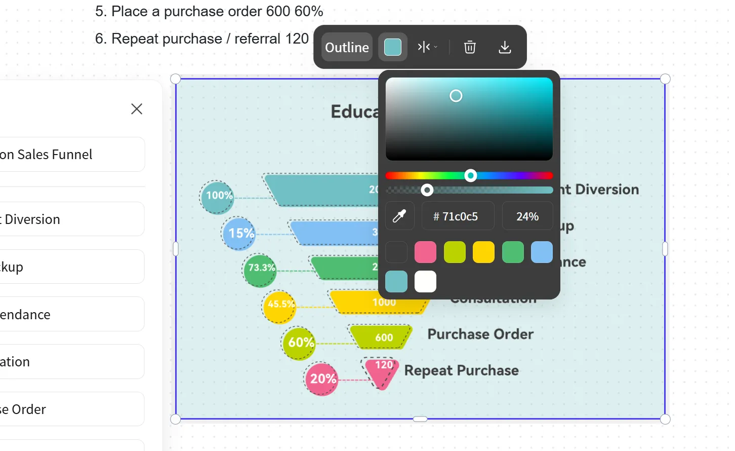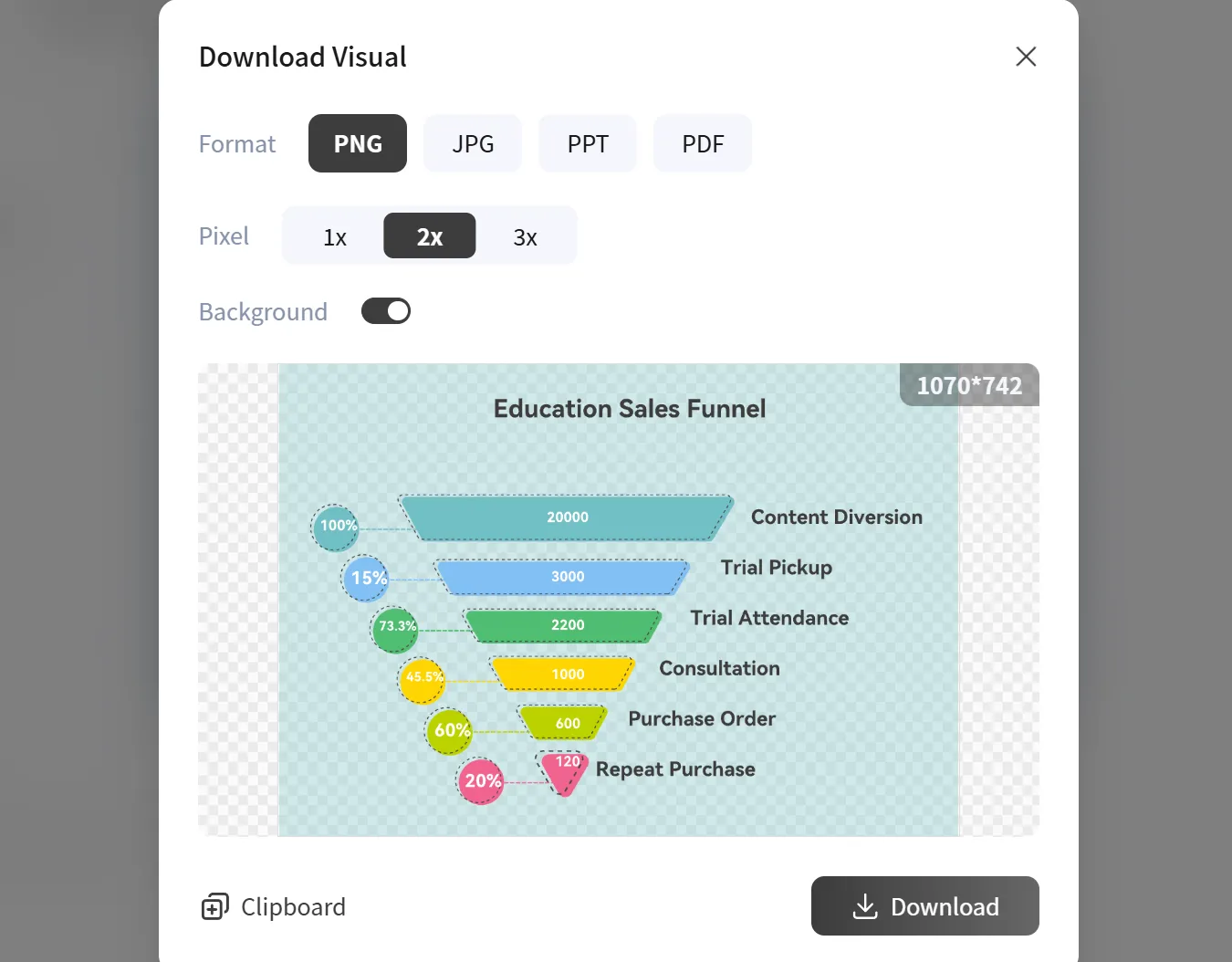 設(shè)計(jì)完成后,您可以將創(chuàng)建的銷售漏斗圖以PNG、JPG等常見(jiàn)格式下載,以便在各種文檔、演示文稿或社交媒體平臺(tái)上輕松使用。