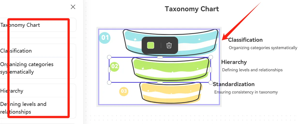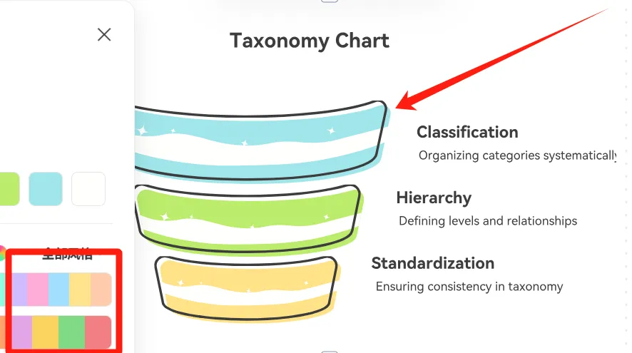 接下來,我們需要進(jìn)一步調(diào)整分類圖的外觀和細(xì)節(jié)。通過點擊顏色調(diào)色板或直接點擊精心設(shè)計的圖像,我們可以調(diào)整復(fù)雜的配色方案、精確的對齊方式和優(yōu)雅的字體。