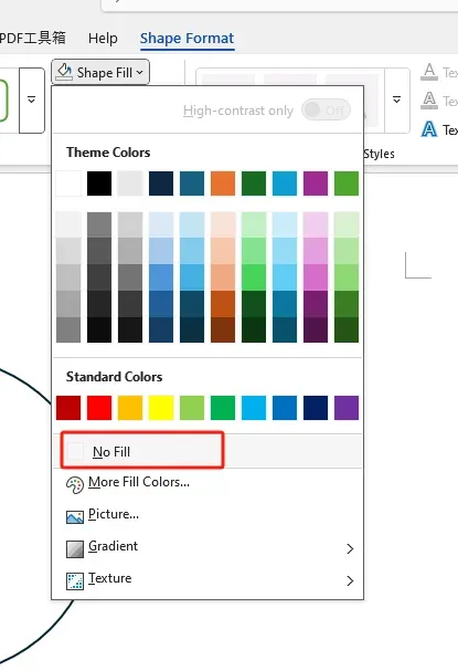 選擇形狀,點(diǎn)擊右上角的“形狀格式”。然后點(diǎn)擊“形狀填充”并選擇“無(wú)填充”選項(xiàng)?,F(xiàn)在圓形已變?yōu)橥该鳌?/span>