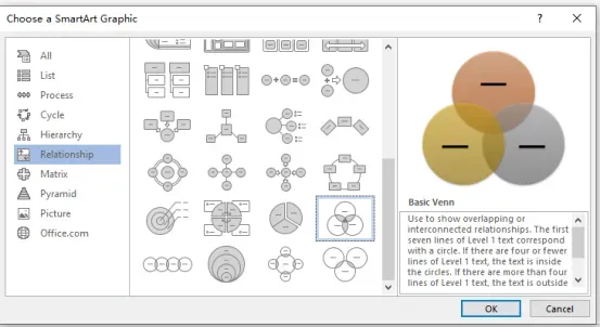 您將看到多種圖表選項(xiàng)。選擇“關(guān)系”以查看可用的五個(gè)維恩圖。在此我們選擇“基本維恩圖”(如圖所示)并點(diǎn)擊確定。